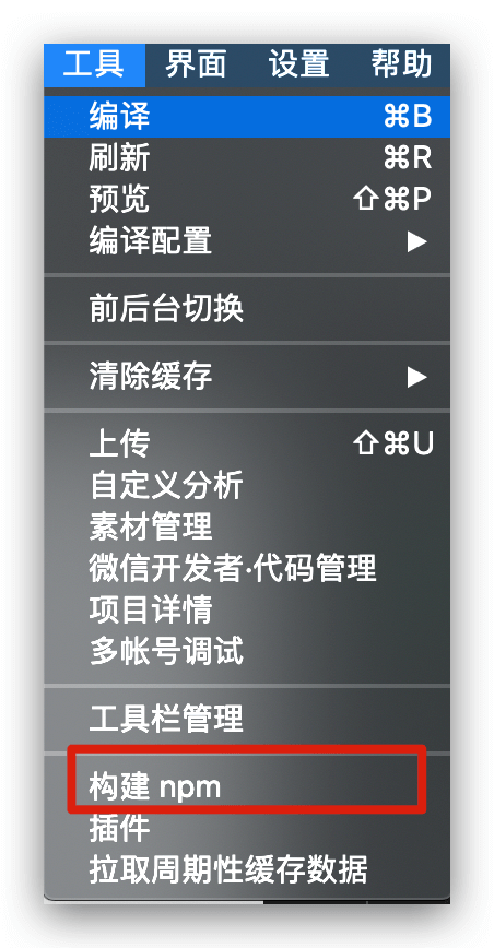 点击开发者工具中的菜单栏:工具 --> 构建 npm: